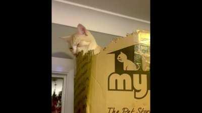 He likes to destroy boxes. He was found in a box by the side of the road at 2 weeks old.