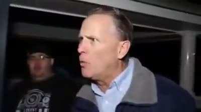 Federal officer briefly raises his live assault rifle at the press line, then takes out mace to try and get them to move