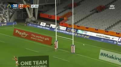 Sam Gilbert kicks a 40m drop goal after a quick throw in